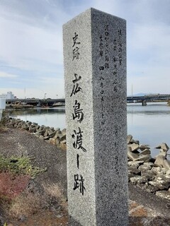 旧吉野川の広島地区には昔渡し船(渡船と言った方が分かりやすい)があったが、広島橋ができ、更に国道の新広島橋が架かっている。その二つの橋の中間くらい川の南には渡船があった跡を示す石柱が建っている。昨今河川の拡幅工事が行われており、石碑も移転をするか、破棄されることだろう。ちょっと寂しい。
