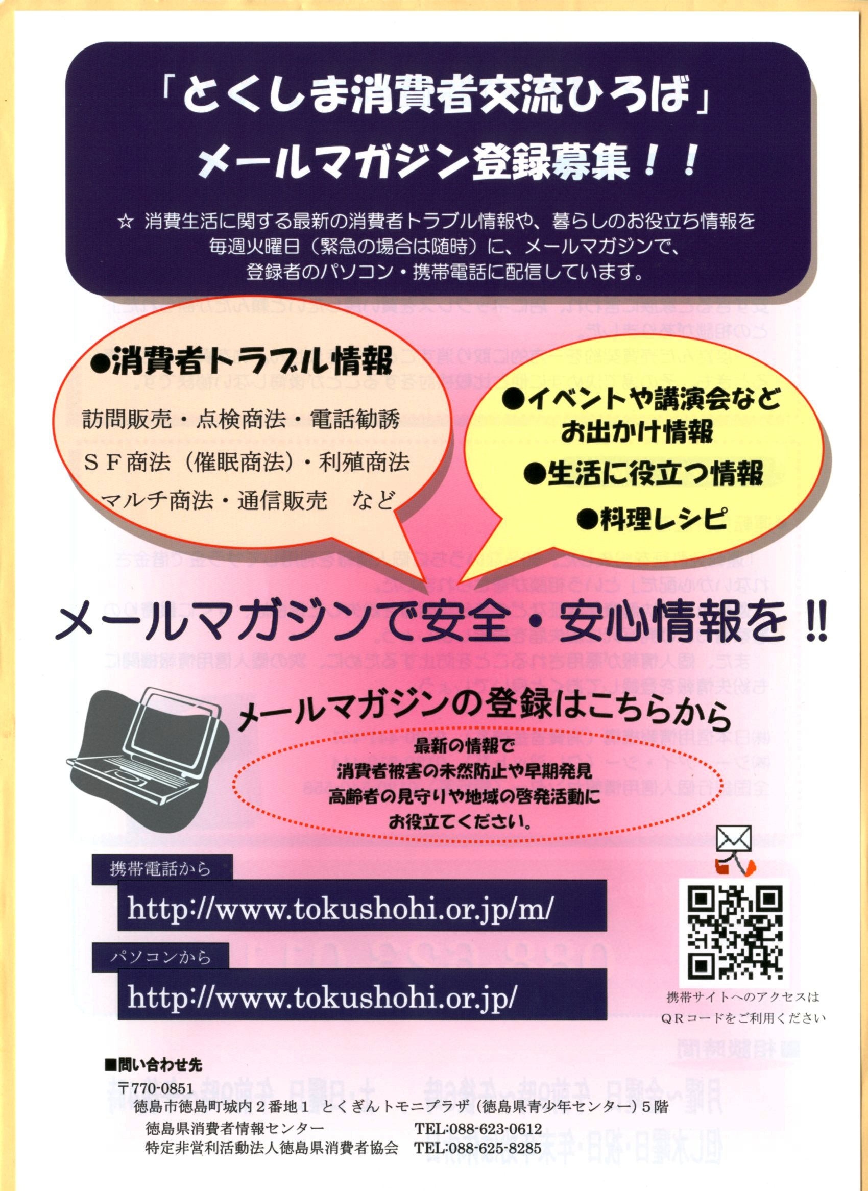 ☆メールマガジン「とくしま消費者交流ひろば」は、消費生活に関する最新の消費者トラブル情報や、暮らしのお役立ち情報を、毎週火曜日(祝日等の場合は変更あり)、また緊急の場合は随時に、登録者のパソコン・携帯電話に配信しています。